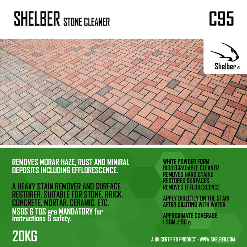 Shelber Cleaner C95 is a high‑performance sulfamic acid powder formulated for heavy‑duty cleaning of stone, tile, and cementitious surfaces. When dissolved in water, it becomes a powerful descaling and residue‑removal solution capable of eliminating grout haze, mortar film, rust stains, efflorescence, and other mineral deposits.